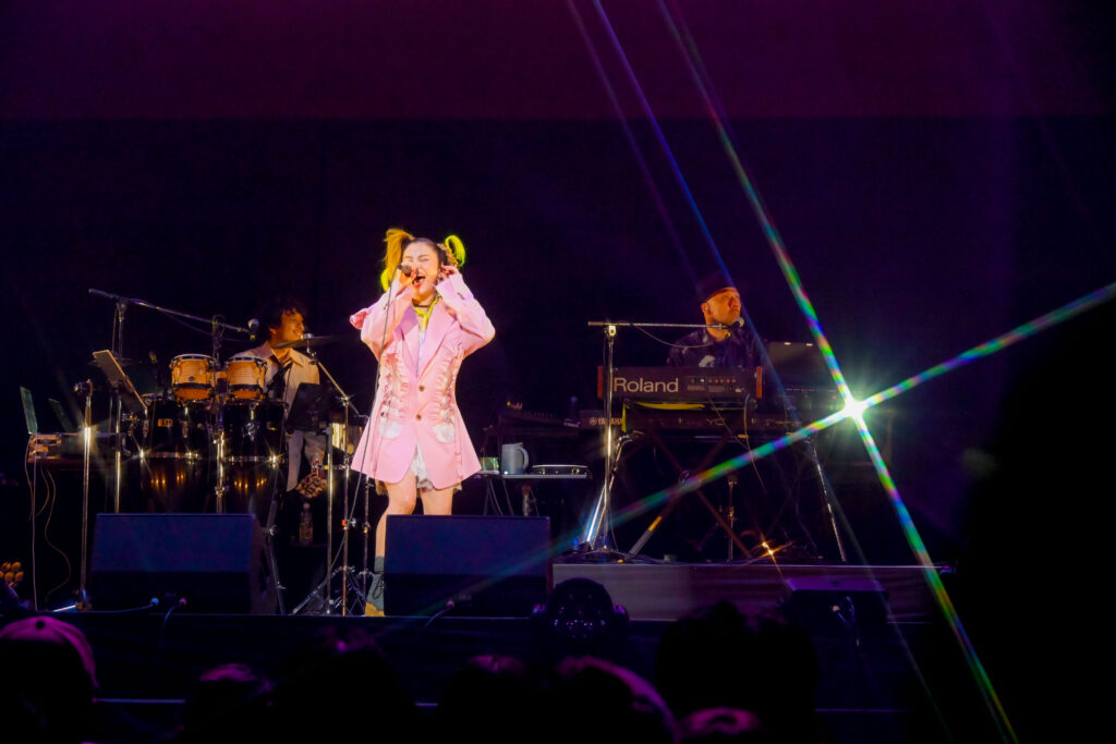 踊るようにして舞台に進むと、まずコール&レスポンスで会場を温め、初っ端からヒットチューン『やさしい気持ち』。チャーミングでコケティッシュな歌声とパフォーマンスでハートを射抜き、当然歓声が起こると「そういうの欲しいです。あまり年末(のフェスには)来ないけど来てよかった」。次の『僕は残像』では浮遊感をまぜつつ観客の集中を高め、続く『A・O・U』ではグルーヴィに。会話するような楽器の音色が加わりパーティになだれ込めばワイパーも発生。曲後には本人から「もっとやりたかったね(笑)」。