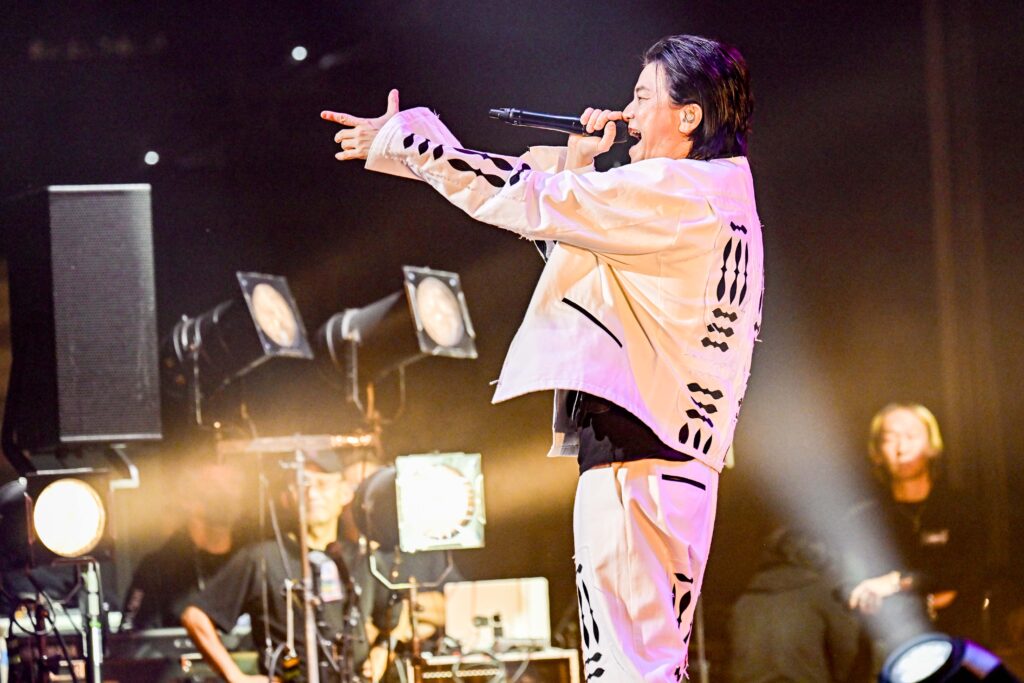 年末らしく豪華にフルバンドを引き連れ、1曲目から曲名よろしく『KIRA KIRA』でキラキラとご機嫌に。レイブホーンも高らかに鳴りテンションも上がると、たくみに表情を変える自由度の高いボーカル&ラップで『Need You Bad』、『Superpower』と連ね、中盤は『LOOP』などの3曲で甘く深い夜へ。つややかなサウンドと湿度も粘度もある歌声は熱も静寂ももたらし、観客の体を揺らす。途中のMCは、関西出身だからこその神戸の思い出も関西弁で語りリラックスした時間。すると今度は「2025年もストレスだらけでしたね(笑)。発散してみませんか?」と『No Stress』で気持ちをグッと持ち上げる。「騒がしいKobeの夜を」とアドリブも盛り込んだ。