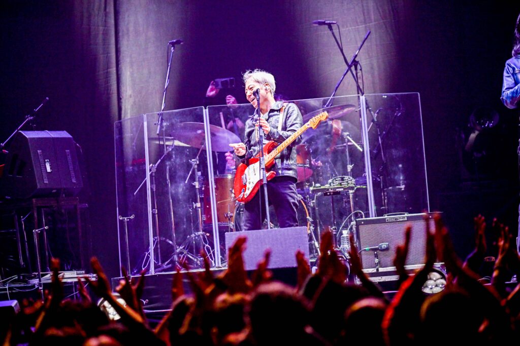 イベントの折り返し地点を過ぎたころ、姿を現したのは2025年にデビュー45周年を迎えた佐野と、現在彼が活動する、結成20周年のTHE COYOTE BAND。そのアニバーサリーと年の瀬のめでたさが相まって、いつもよりゴージャスに響く『Youngbloods』で爽快に走り出したあとは『ガラスのジェネレーション』の再定義ナンバー『つまらない大人にはなりたくない』へ。J-ROCKの地平を切り開いたまばゆい言葉が大空間に行き渡り、骨太でエッジのきいたサウンドとともに無数の拳を突き上げさせる。